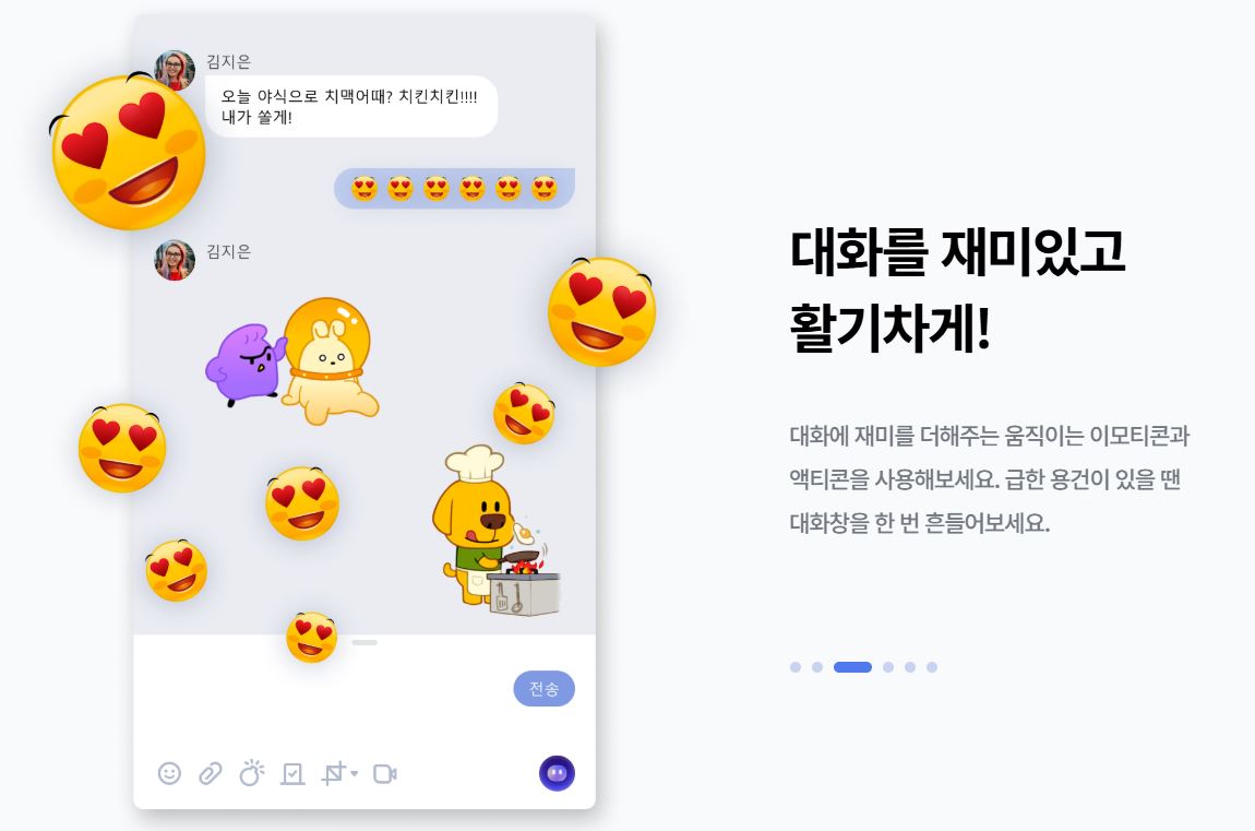 멘션, 주의대화방, 답장 기능 등은 조직 내 소통을 보다 명확하게 만들어줍니다. 또한 이모티콘과 액티콘을 통해 감정 표현도 자유롭고 재미있게 할 수 있습니다. 줌 화상회의 기능도 내장되어 있어 한 번의 클릭으로 회의를 시작할 수 있습니다.
