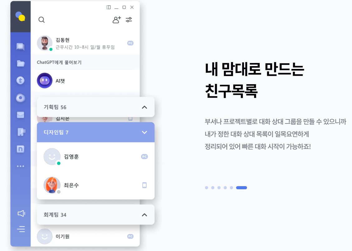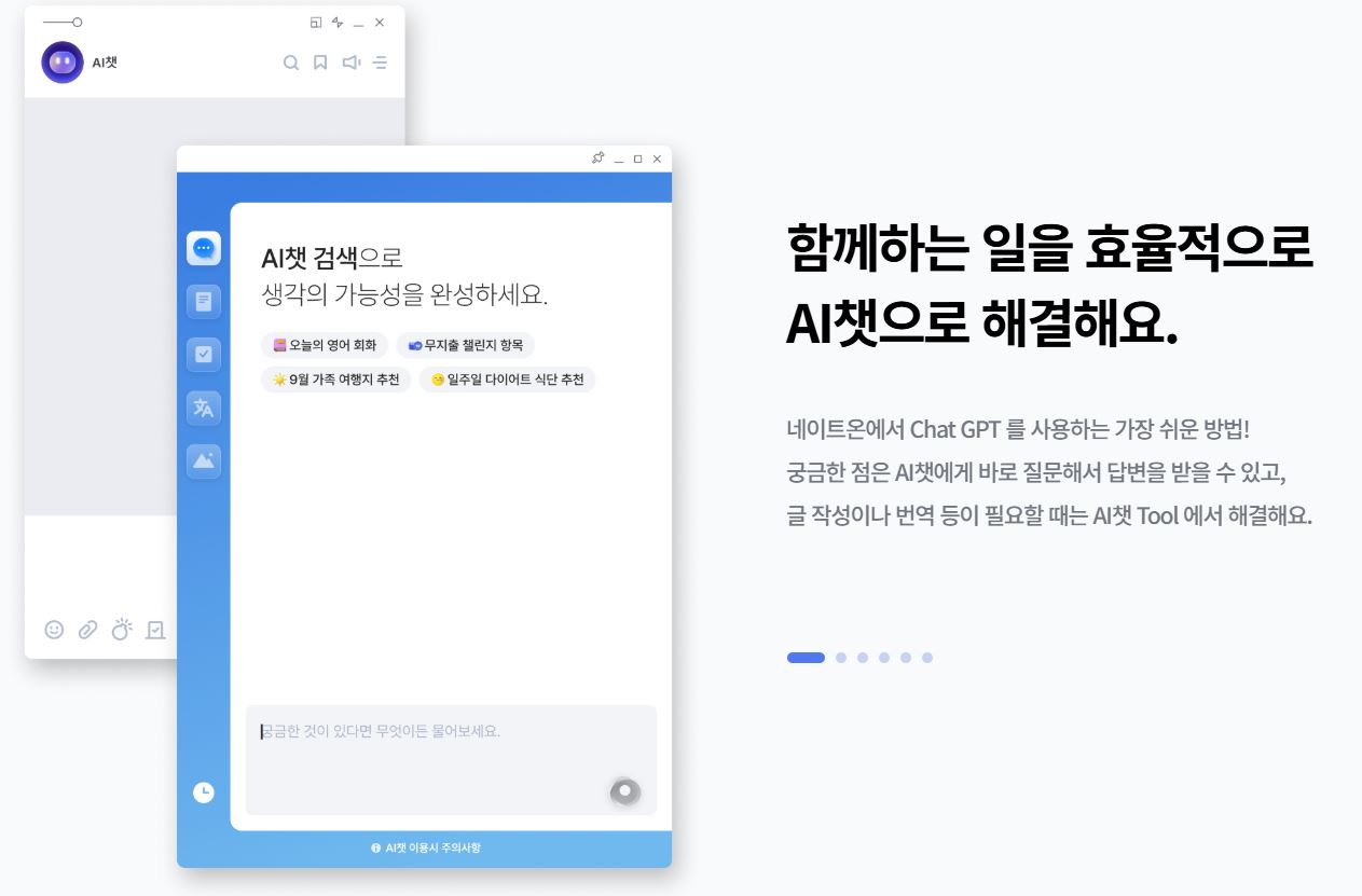 ChatGPT 기반 AI 챗봇을 통해 질문 응답, 글쓰기, 번역 등을 지원합니다. 네이트온 내에서 별도 설치 없이 바로 사용할 수 있습니다.