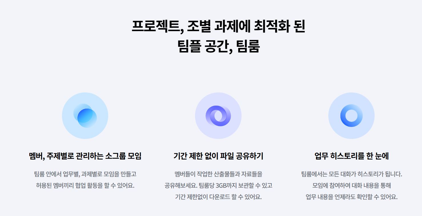 조별과제, 프로젝트 업무를 위한 ‘팀룸’ 기능은 업무 히스토리 공유, 파일 보관, 대화방 관리 등 팀 단위 협업을 손쉽게 만들어줍니다. 3GB까지 파일을 무제한 기간 보관할 수 있어 자료 관리도 편리합니다.
