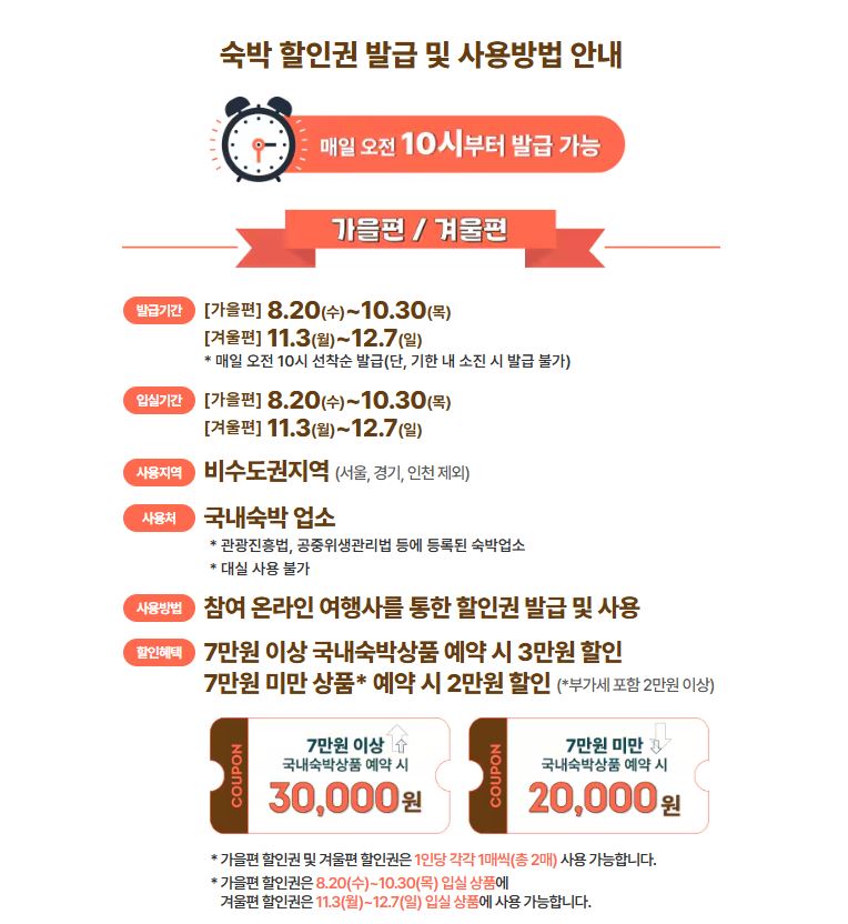 서울, 경기, 인천을 제외한 전국의 비수도권 지역에서 사용 가능한 쿠폰을 발급받아 숙박 시 즉시 할인 혜택을 받을 수 있습니다.