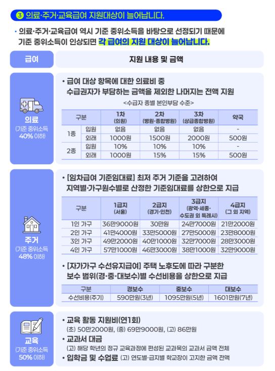 중위소득이 역대 최고 수준으로 인상되며 생계급여, 의료급여, 주거급여 등 수급 대상도 확대될 예정인데요.