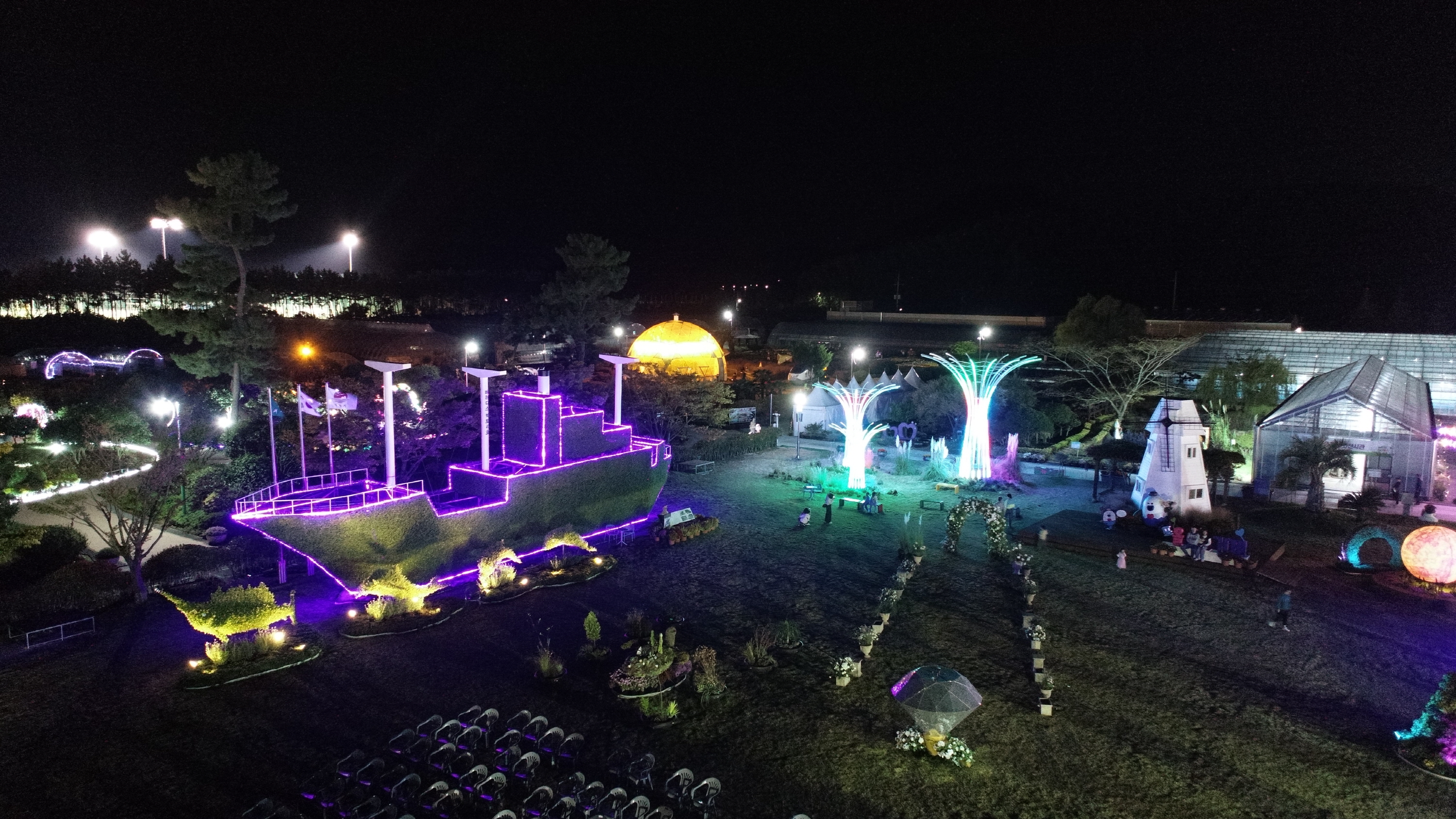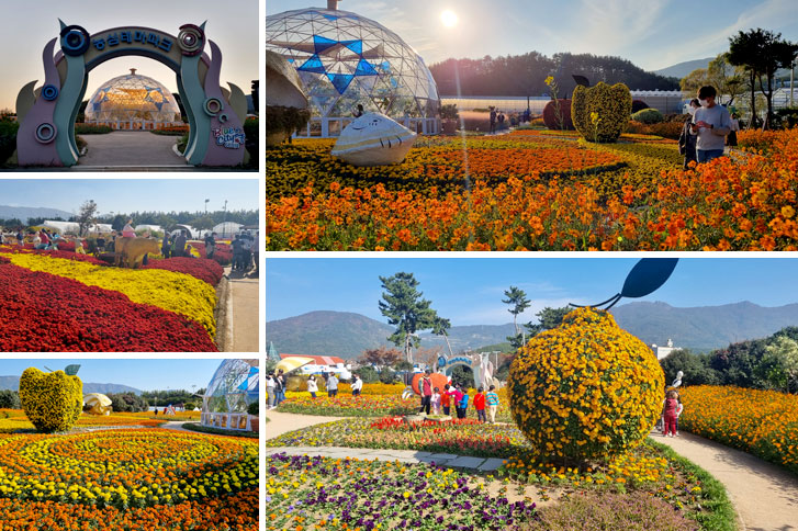 ✔️ 국화 테마 정원: 다양한 색과 모양의 국화 조형물